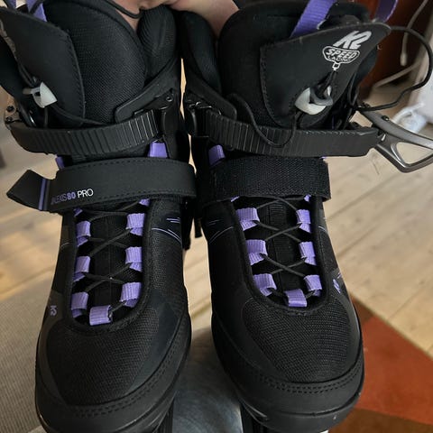 K2 Helena 80 rulleskøjter i størrelse 39. Skøjterne er sorte med hvide detaljer og har en justerbar lukning med spænde. Designet til kvinder og egnet til rekreativ rulleskøjtning.
