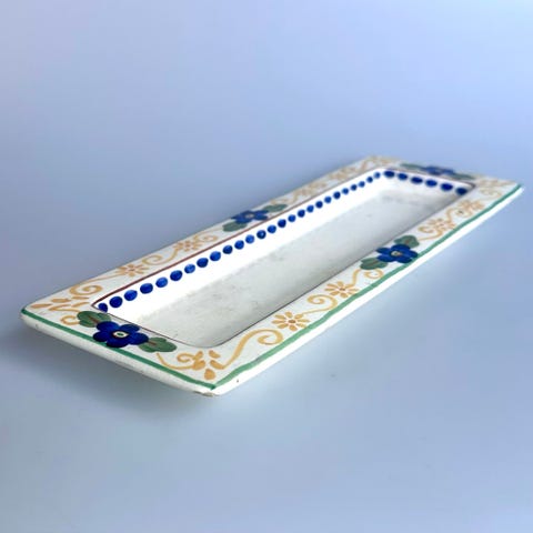 Fad i blå keramik med dekorativt mønster. Fadskålen har firkantet form og er velegnet til servering eller som dekorativt element.