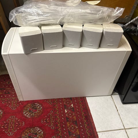 Bose højtalersystem med subwoofer og to satellithøjttalere. Systemet har sort kabinet og tilhørende kabler. Velegnet til brug med computer eller hjemmeunderholdning......små mærker på den ene side .....betaling ved afhentning