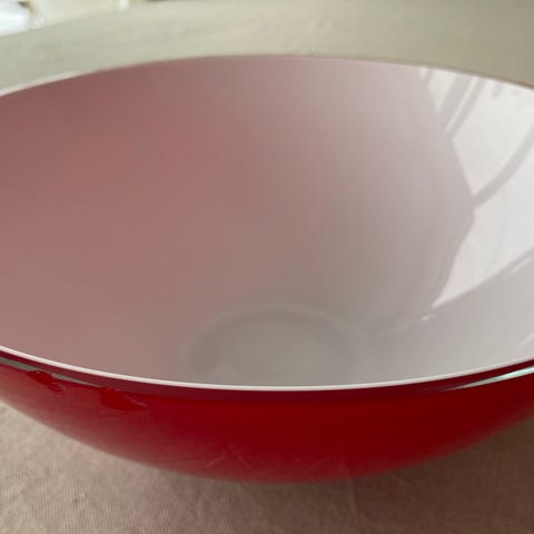 Holmegaard skål i rød farve. Skålen har en rund form og er lavet af glas. Velegnet til brug i køkkenet til servering eller opbevaring.