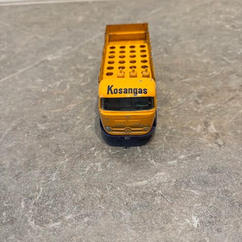 Tekno Lastbil legetøj i rød og gul farve. Fremstillet i metal med detaljer i sort og grøn. Modellen er en lastbil med lad, velegnet til samling eller leg.