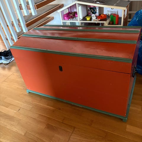 Super fin blå kiste til opbevaring på f.eks. børneværelset. Der er påklistret fine vægklistermærker fra “Thats Mine”. De kan fjernes uden spor og endda nemt påklistres en anden overflade.