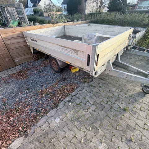 Brenderup BR 410 trailer med åben lad og dobbelt aksel. Trailerens overflade er træplade, og den har en grå farve. Egnet til transport af forskellige materialer og gods.
