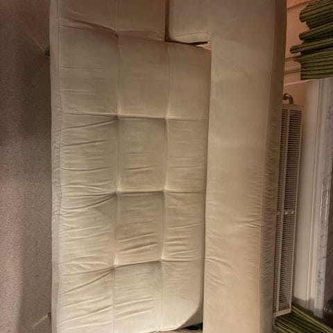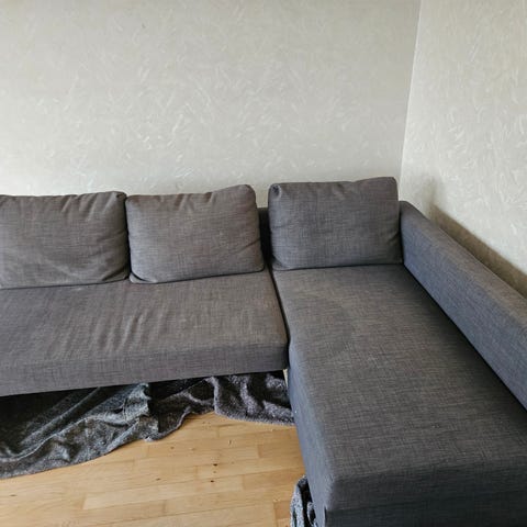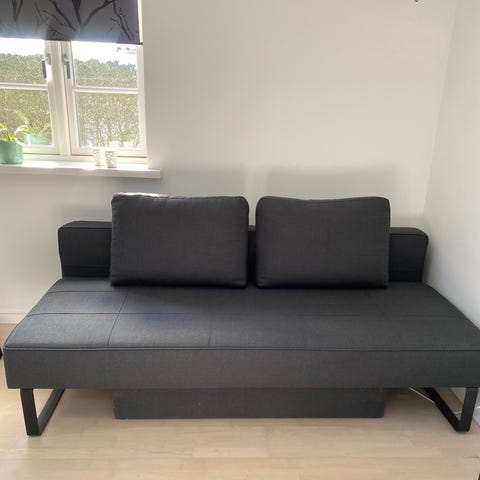 Sovesofa som han hæves i trin langs siden og ende så den også kan bruges som alm sofa. Anderledes end en alm sovesofa.