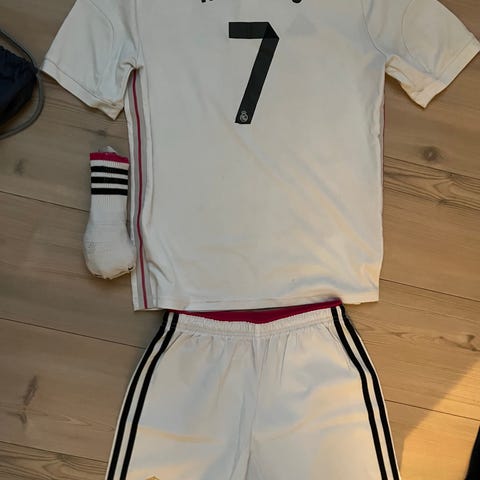 Fodboldtøj, str. 152, 7 dele, Real Madrid, Flamingo, Frankrig og Danmark.