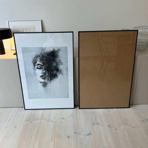 IKEA billederamme i træ malet sort med mat maling. Elegant tynd ramme. Måler ca 73 cm i højden x 53 cm. Let at udskifte plakat. Kan hænge på alle sider.
