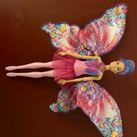 Barbie dukker med forskellige kjoler, herunder sommerfuglevinger og prinsessekjoler i pink og lilla farver. Dukkerne har detaljerede tøjdesigns, der passer til leg og samling. Sommerfuglen kan foldes ud og samme. Danse kjolen kan også foldes uf og sammen. Den sidste synger en melodi når man aktiverer den. 125,- stykket eller alle tre for 300,- Fra ikke ryger hjem.