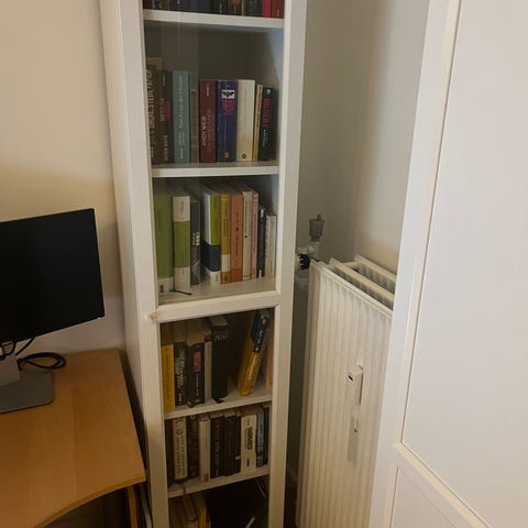 Har brugsspor. Der er boret huller i det ene sidestykke for at sætte den sammen med en anden reol.