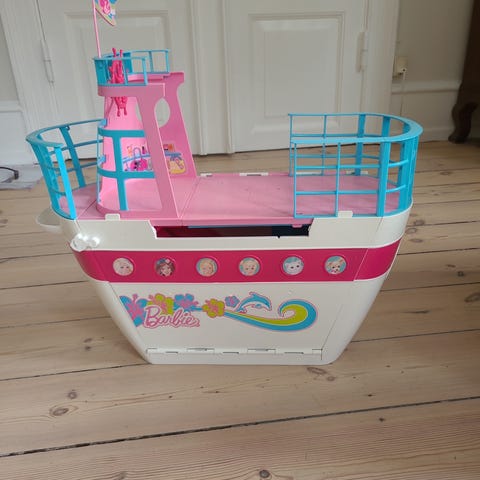Barbie båd legetøj med tilbehør. Båden har et åbent dæk med plads til flere figurer og inkluderer en lille rund flydeenhed med tre små figurer. Legetøjet er designet til børn og kan bruges til rolleleg og fantasifuld leg.