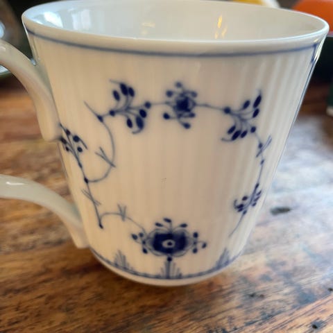 Bogstavet K er håndmalet med ét enkelt penselstrøg i den klassiske blå farve. Designet er inspireret af Royal Copenhagens ikoniske Musselmalet Riflet og formgivet efter den klassiske højhankskop. Et personligt og tidløst krus – perfekt som gave.