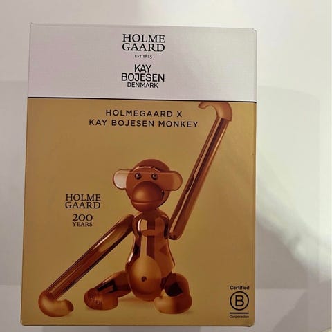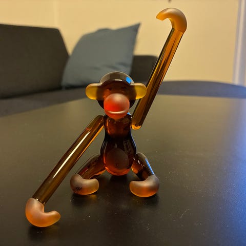 Holmegaard x Kay Bojesen mini abe i glas i farven amber/orange. Det er 200 års jubilæums abe som ikke kan fås i butikker. Den er helt ny og i original kasse.