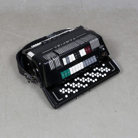 Elektrisk Solton knapharmonika med tilhørende programmer/synth/trommecomputer: “Solton Super Polyvox”. Harmonika kan dog også bruges akustisk.
