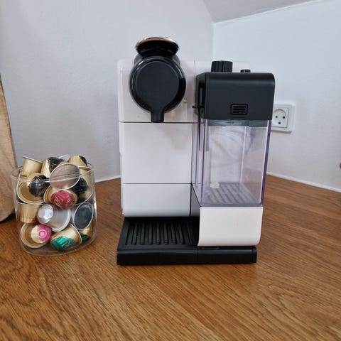 DeLonghi Nespresso Lattissima kaffemaskine i hvid farve. Kaffemaskinen har en integreret mælkeskummer, og du kan lave latte og cappuchino med et enkelt tryk. Den er designet til brug med Nespresso-kapsler og har flere betjeningsknapper til forskellige kaffeindstillinger. Maskinen er udstyret med en drypbakke og en aftagelig vandtank. Er afkalket jævnligt med Nespressos afkalkning. Fungerer helt fint, selvom den er brugt meget.