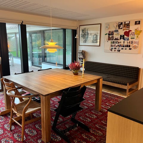 Spisebord af egetræsstave. Bordpladen er nyolieret og fremstår rigtig flot med kun enkelte små mærker (se sidste billede for eksempel).