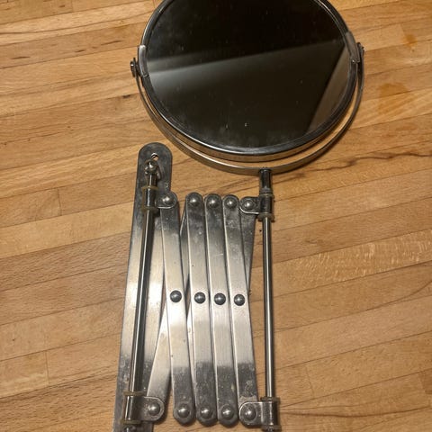 IKEA FRÄCK vægmonteret spejl med udtrækkeligt armdesign i metal. Spejlet har en rund form og kan justeres i afstand fra væggen ved hjælp af det foldbare armstativ. Velegnet til brug i badeværelse eller andre rum, hvor justerbart spejl er nødvendigt.