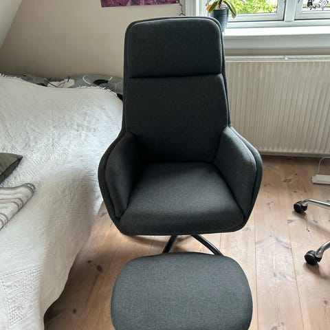 Tankedal-stol fra JYSK (nypris 1700,-) mindre end 1 år gammel. Har brugsspor efter en kat der kravlet i den, men er ellers i perfekt stand. Kan dreje 360 grader og vippes tilbage.