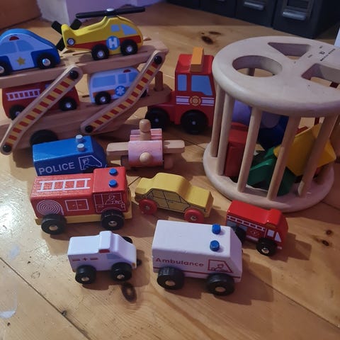Diverse trælegetøj bl.a. klodser med forskellige raslelyde, kran med anhænger og magnetiske klodser, indkøbskurv med diverse varer, puslespil og instrumenter.