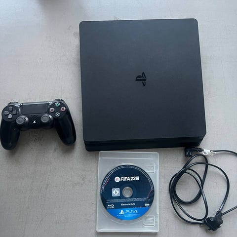 Sony Playstation 4 Slim spillekonsol i hvid farve. Inkluderer to hvide controllere, nødvendige kabler til tilslutning og floating gribs. På den ene controller er gummiet faldet af på den ene thumbstick