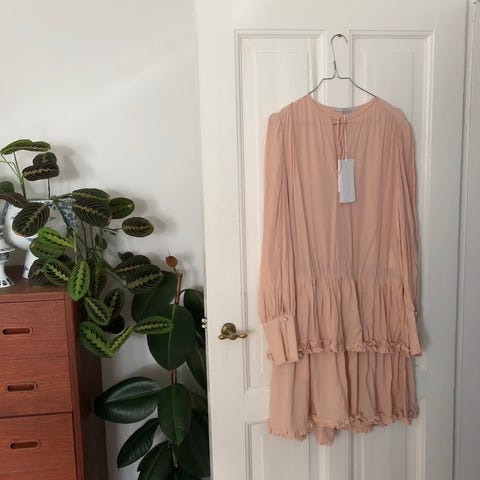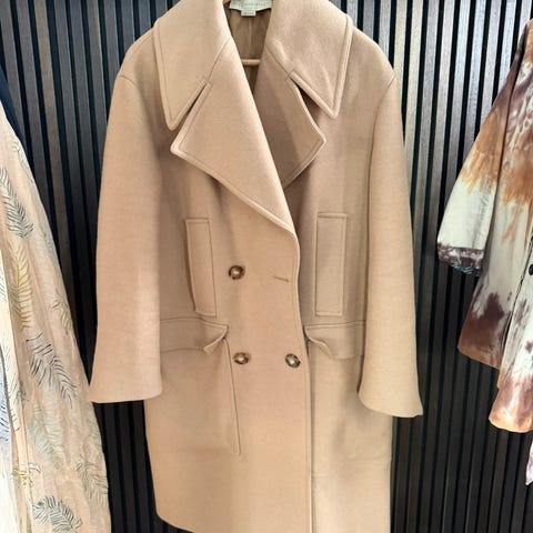Stella McCartney Frakke. Frakken er beige og lavet af lækker blød uld. Den har en klassisk oversize pasform med knapper og lommer. Unik strikker krave og knapper op langs siderne.