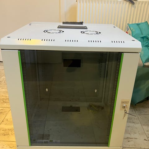 Digitus racisistiske for netværksudstyr. Næsten ubrugt. Der medfølger 2 x hylder, 1 x strømforsyning med volt og ampere måler og 1 x blændeåbning som vist på billederne.