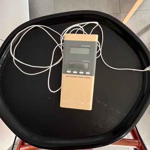 Fuldt funktionelt lille thermometer, som viser indendørs og udendørs temperaturer.