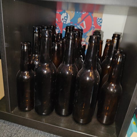 Sæt bestående af 6 brune genlukkelige glasflasker med låsemekanisme gives bort. Flaskerne er velegnede til hjemmebrygget øl.