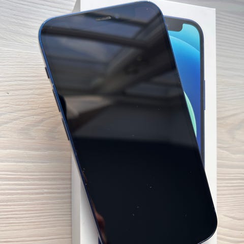 Apple iPhone 12 Pro smartphone med 128 GB lagerplads. Enheden har en blå farve og viser brugsspor på kanterne, herunder ridser og slid. Skærmen er intakt og fungerer som forventet, men har en lidt dybere ridse som vises på billedet.