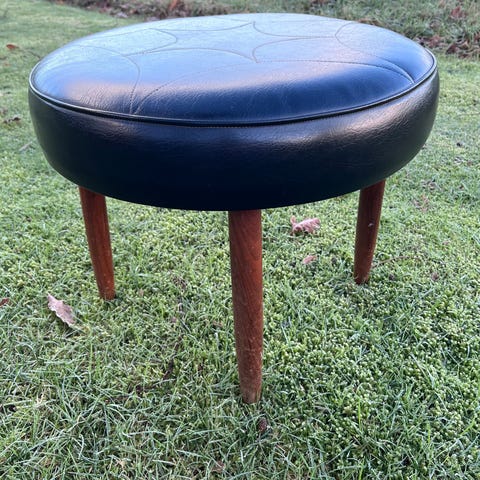 Rund skammel med brunt læder polstret sæde og koboltblå ben. Skamlen har et simpelt og funktionelt design med polstring, der kan bruges som siddeplads eller fodstøtte.