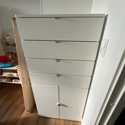 Fint børneklædeskab. Jeg har hængt lågerne for højt, men dette kan bare fixes. Og så er der et lille hul ved hængslerne. Derfor prisen.