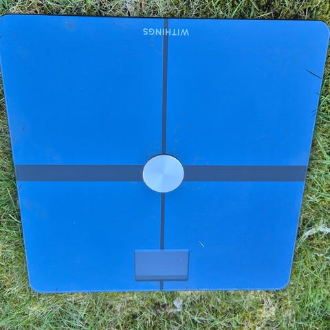 Digitale badevægt med glasoverflade i grøn og hvid farve.