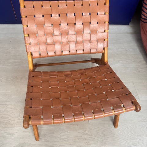 Lænestol i massiv teak med sæde og ryg i cognacfarvet kernelæderflet.