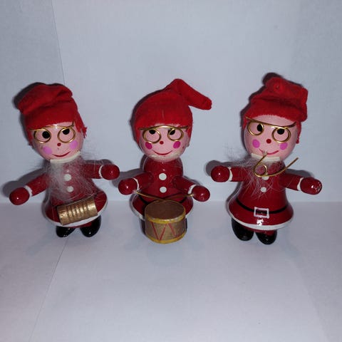 3 forskellige gamle nisser fra Daells Varehus. Pynter fint som de står, ellers er der lille hul i nissehuerne til tråd/bånd, så de kan hænges op. De fremstår i hel stand med slid på bemalingen flere steder. Alle er stemplede bag på. Højde ca 9 cm. Sælges samlet til kr 150,-