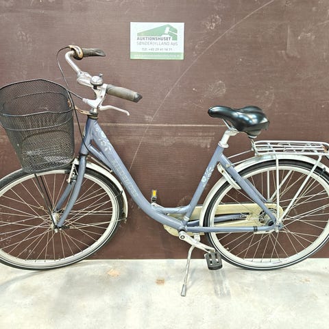 Kildemoes City damecykel. Den er købt brug for nogle år siden. Tidligere ejer havde væltet på den, hvilket er grunden til skrammerne og at kurven er lidt skæv.