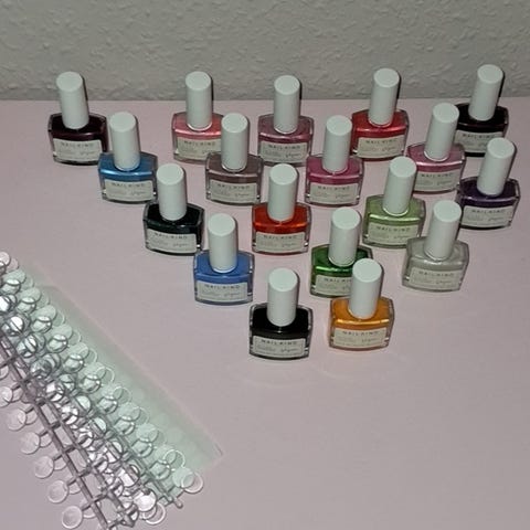 10 neglelakker fra Nailkind. De fleste uåbnede. 10 forskellige farver. Sælges samlet. Nypris pr. stk 36,-