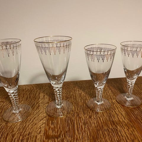 Marselisborg Amager glas med gulddekor i klart glas. Designet af Jacob Bang Kastrup glasværk med snoet stilk og dekorative guldkantdetaljer.