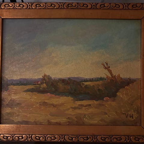 Andet, v. hartmack, motiv: Landskab, stil: Naturalistisk, b: 47cm h: 27cm, landskab malet af v. hartnack elev af Harald gjetsing. udstillet siden 1928, det står på en lille seddel bag på.