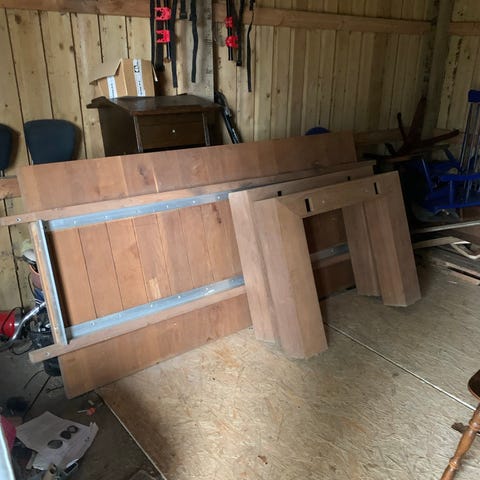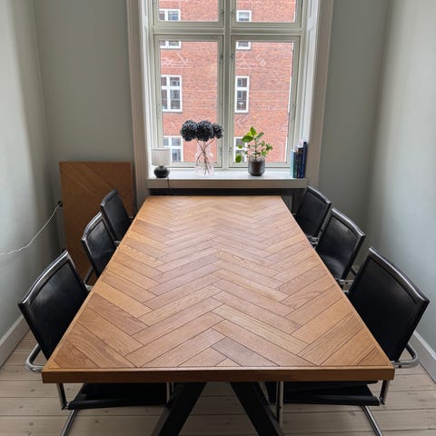 Rigtig fin spisebord med egetræs ben og højtrykslaminat på pladen.