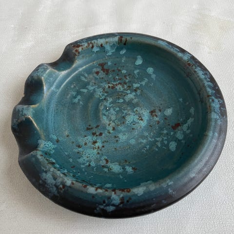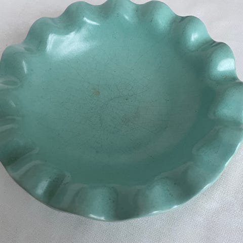 Lille skål eller stort askebæger i grøn og orange farver. Måler 17 cm i diameter. Heg sender gerne på købers regning. Het minimalt afslag - se Foto.