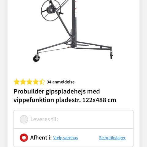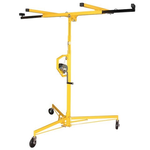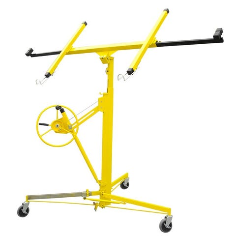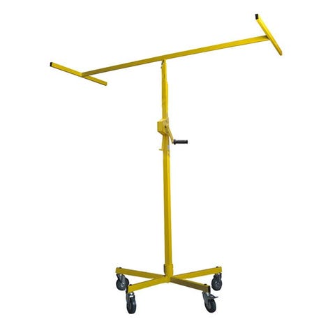 Gipspladeløfter i metal designet til at lette montering af gipsplader i lofter. Udstyret med justerbare arme og hjul for nem positionering og håndtering under loftsarbejde.