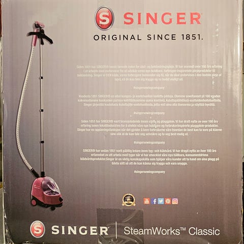 Singer SteamWorks Pro Plus damprenser med indstillinger til silke, uld, bomuld og linned. Enheden har et håndtag, justerbar stang og en slange til dampudledning. Designet til at fjerne folder og friskgøre tøj.