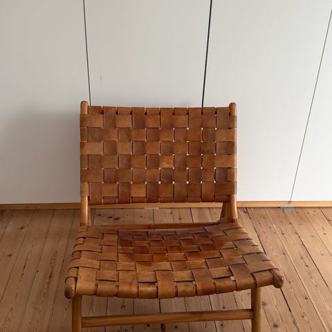 Lænestol i massiv teak med sæde og ryg i cognacfarvet kernelæderflet. Købt fra i butikken no78 på Nørrebrogade. Ny pris: 4.995 kr.