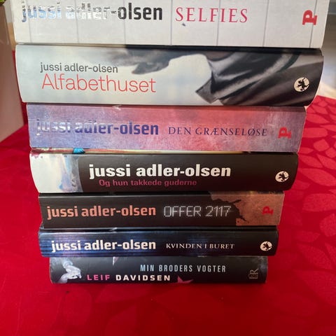 Jussi Adler-Olsen bogpakke bestående af fire bøger: Alfabetuset, Kvinden i buret, Journal 64 og En fjerde bog. Bøgerne er skrevet på dansk og tilhører krimi- og thriller-genren. Kan sendes. Bud ønskes