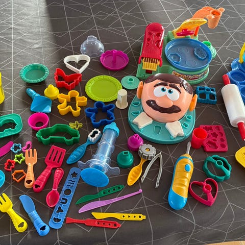 Modellervoks, Modellervoks med tilbehør , Play-doh, KÆMPE pakke med blandet modellervoks og en masse tilbehør sælges. Der er kage sæt, bygge sæt, mad sæt, tandlæge sæt hvor der er bor der bruger batterier med og meget mere. Obs- modelleret er ikke nyt. Nok til masser af timers sjov og fantasi.