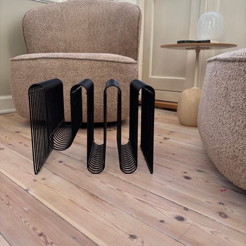Curva magasinholder i stål Designet af Curva magasinholder er blevet et øjeblikkeligt ikon. Den perfekte kombination af form og funktion er hemmeligheden bag dette designs succes. Magasinholderen blev hædret med "Lifestyle Award" i 2018 og er fremstillet af 100 % stål. Produktinformation: Fremstillet af 100 % stål. Plejeanvisning: Brug en fugtig klud med varmt vand og et mildt rengøringsmiddel til at fjerne snavs og støv. Tør om nødvendigt genstanden af med en blød, tør klud. Undgå at ridse med en skureklud, da det kan beskadige overfladen.