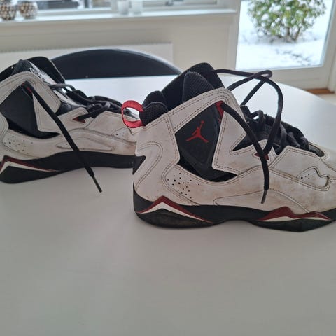 Air Jordan Sneakers i størrelse 39. Farven er en kombination af grå og sort. Designet er klassisk med Nike-logo og Wings-logo på siden. Skoene er lavet i materialer, der inkluderer læder og tekstil.