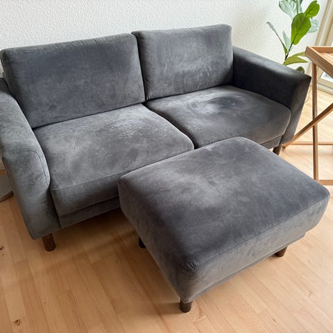 2-personers sofa med antracitgrå velour-lignende stof med tilhørende puf.