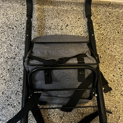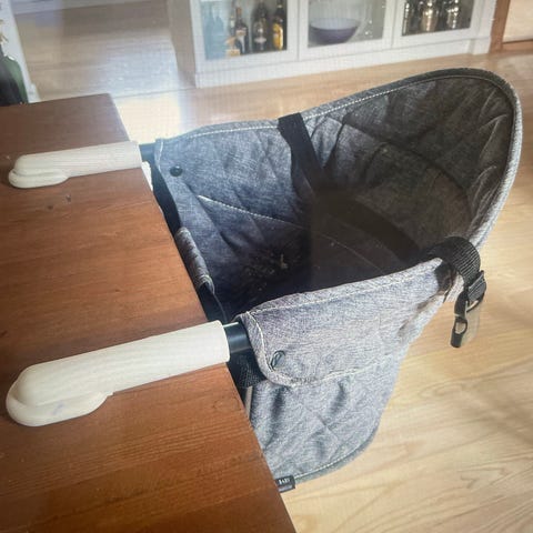 Basson Baby højstol i gråt stof. Designet til børn med justerbare stropper og polstret sæde for komfort. Let at fastgøre på voksenstol og nem at transportere.