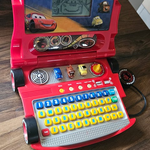 Disney Lynet McQueen legetøjscomputer med farverigt tastatur og skærm. Designet til børn med tema fra Cars-filmene. Fremstillet i plast og med interaktive funktioner til læring og leg.
