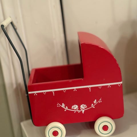 Maileg træ legevogne til børn i forskellige farver. Legevognene har hjul og håndtag, designet til børns leg og bevægelse.