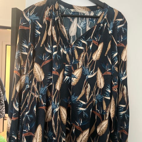 bluse i multifarvet silke, størrelse 36. Blusen har et mønstret design og er lavet af 95% silke, hvilket giver et let og behageligt materiale. Velegnet til kvinder.